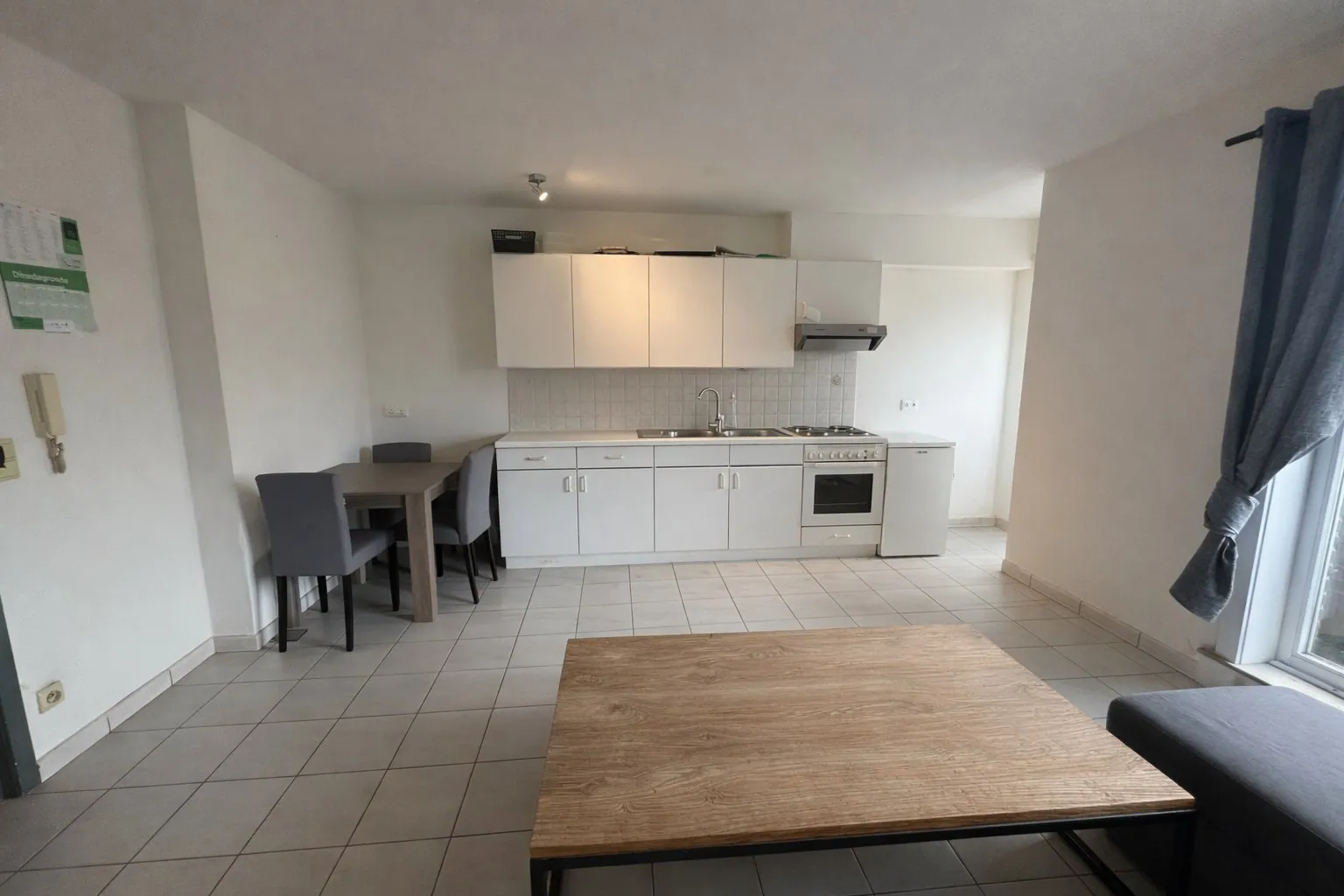 ruime inkomhal met afzonderlijk toilet, lichtrijke leefruimte met open keuken (oven, dampkap, kookplaat), 1 slaapkamer en badkamer met ligbad.