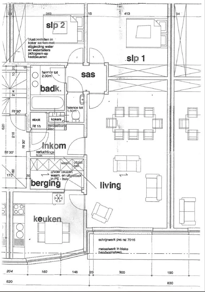 ruime inkomhal met vestiaire en een technisch lokaal (ketelruimte), vervolgens vinden we de aangename leefruimte met groot schuifraam naar het terras, verder hebben we aan de voorzijde een compleet uitgeruste keuken: tijdloos, met stijlvolle natuursteen werkbladen en aansluitend bij de keuken een praktische ingerichte berging.