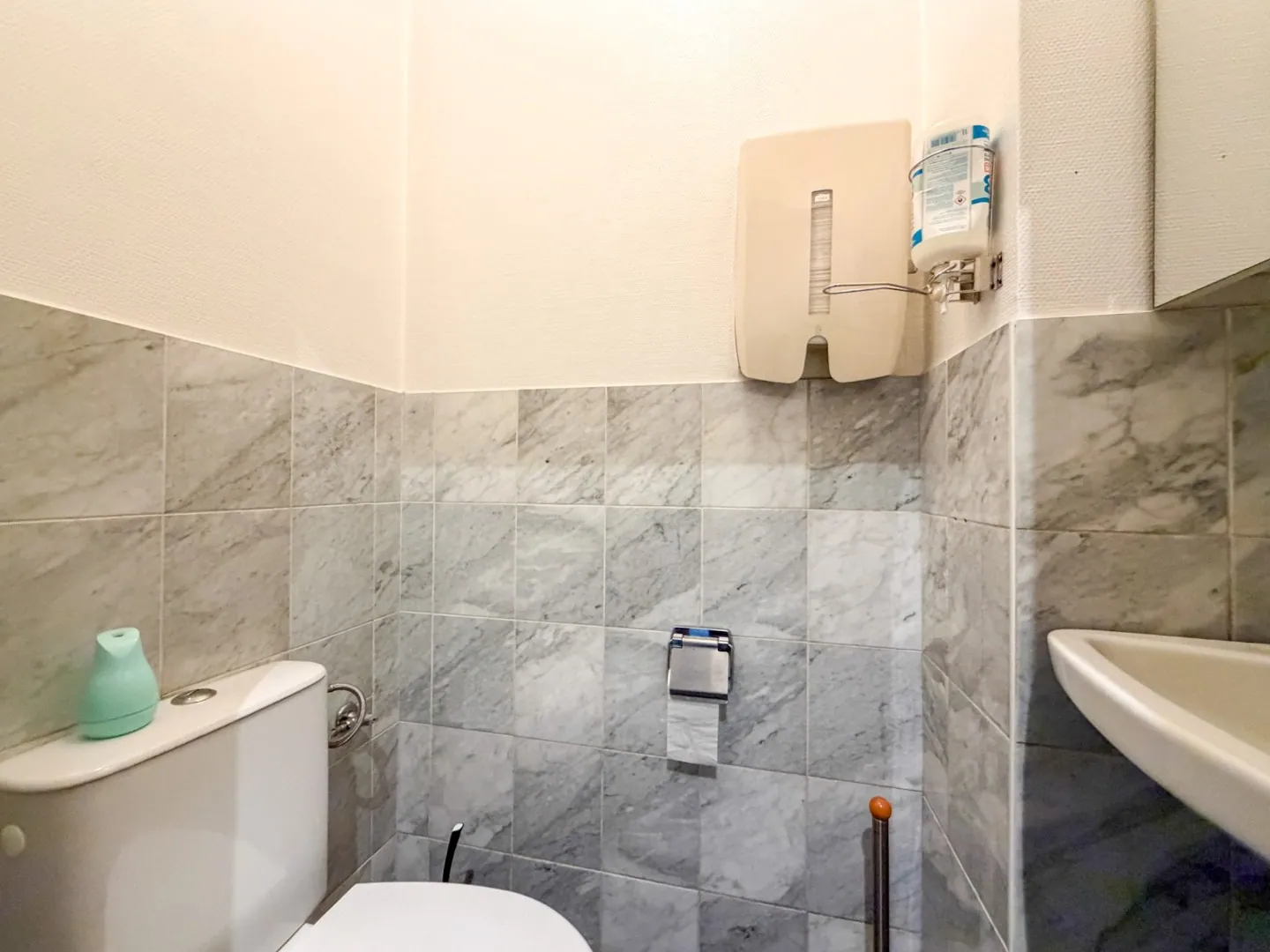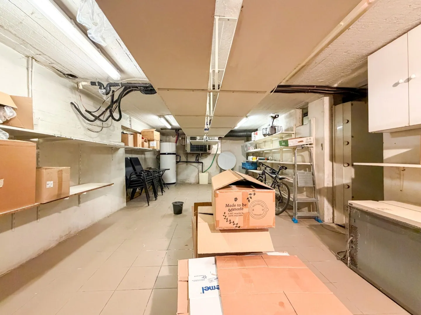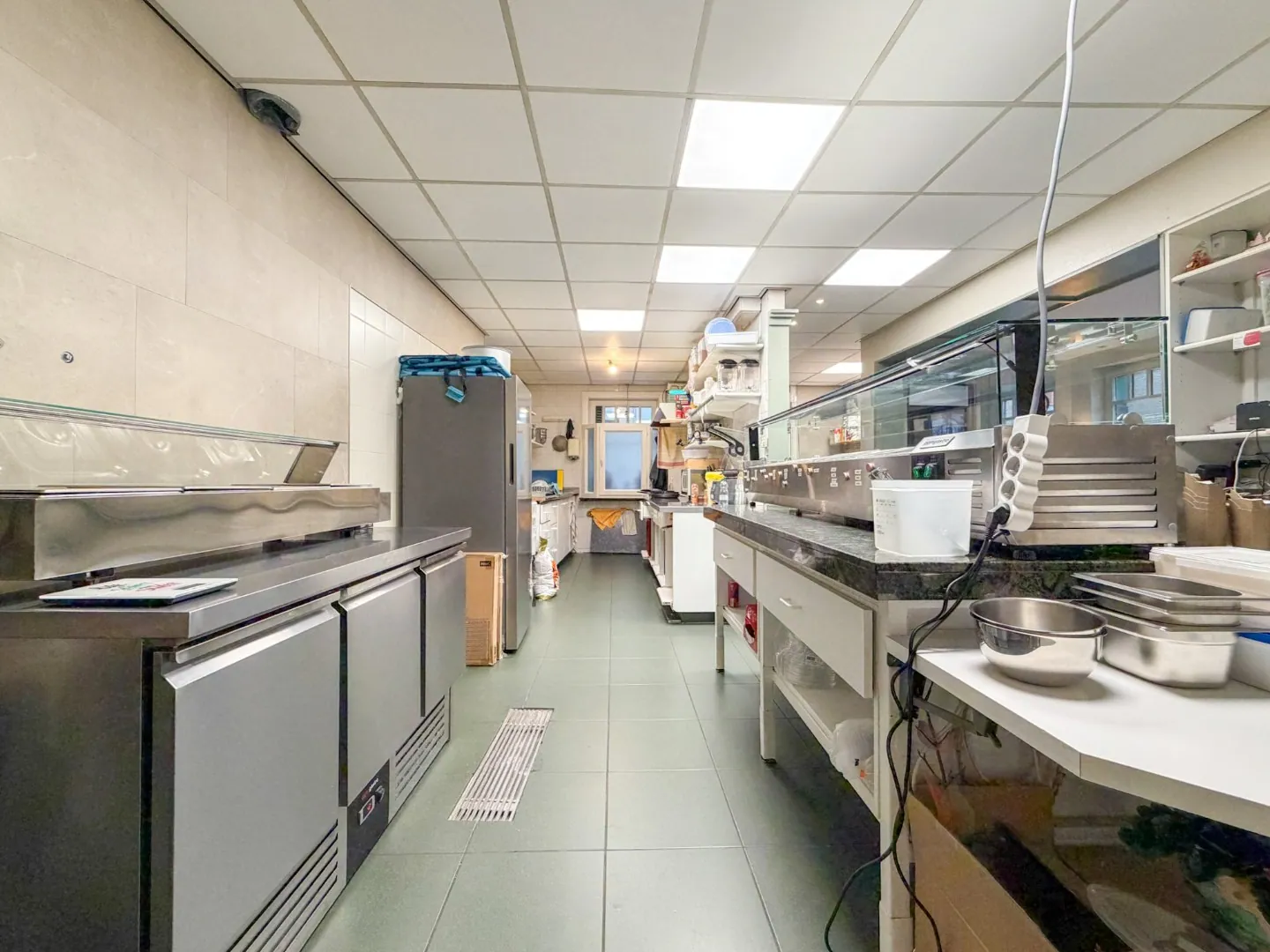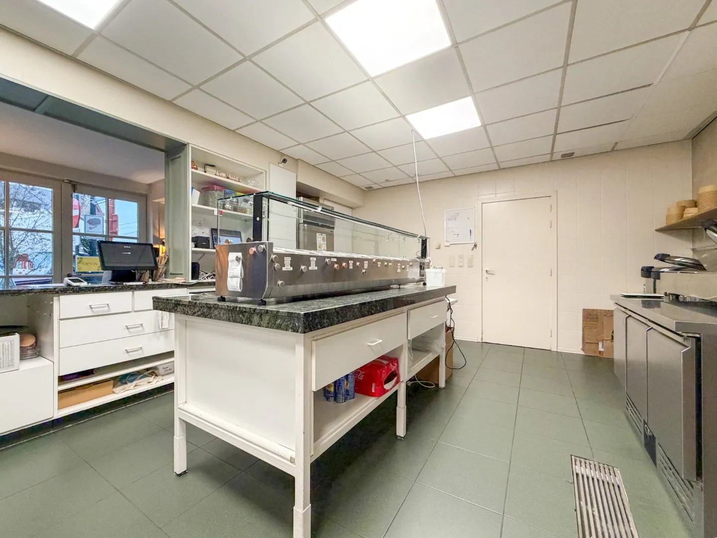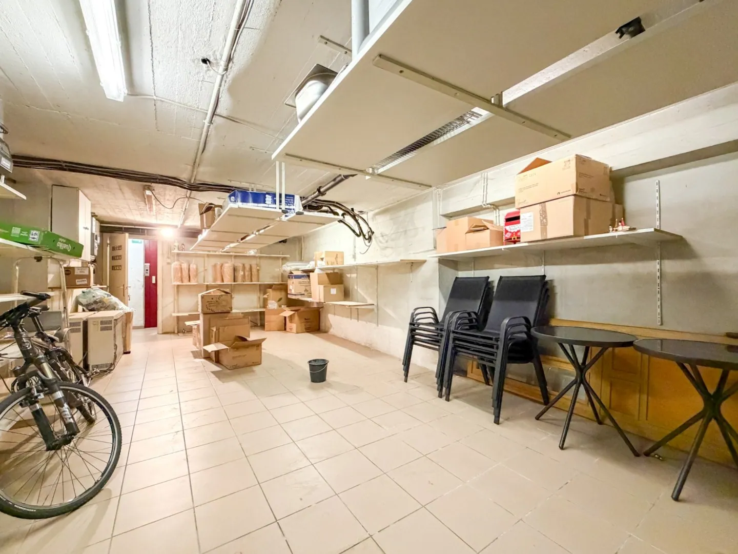 Er is een aparte toegang voor klanten én een toegang via de gemeenschappelijke delen (levering, personeel). Bij de winkelruimte mét atelier hoort ook een grote kelderruimte (lift én trap) van +/- 35 m², perfect voor opslag, koeling, voorraad,... Ten slotte is er ook nog een privaat afzonderlijk toilet bij het handelspand. De vaste inrichting hoort bij het pand (keuken, toog, uitstalramen, kasten, rekken,...).