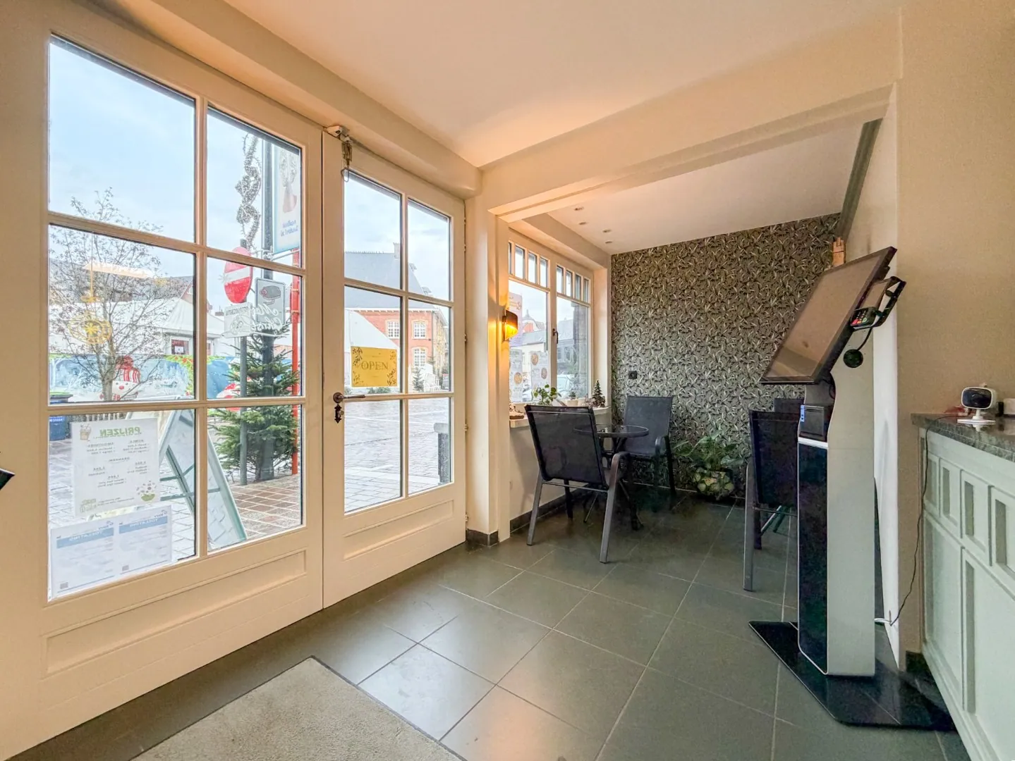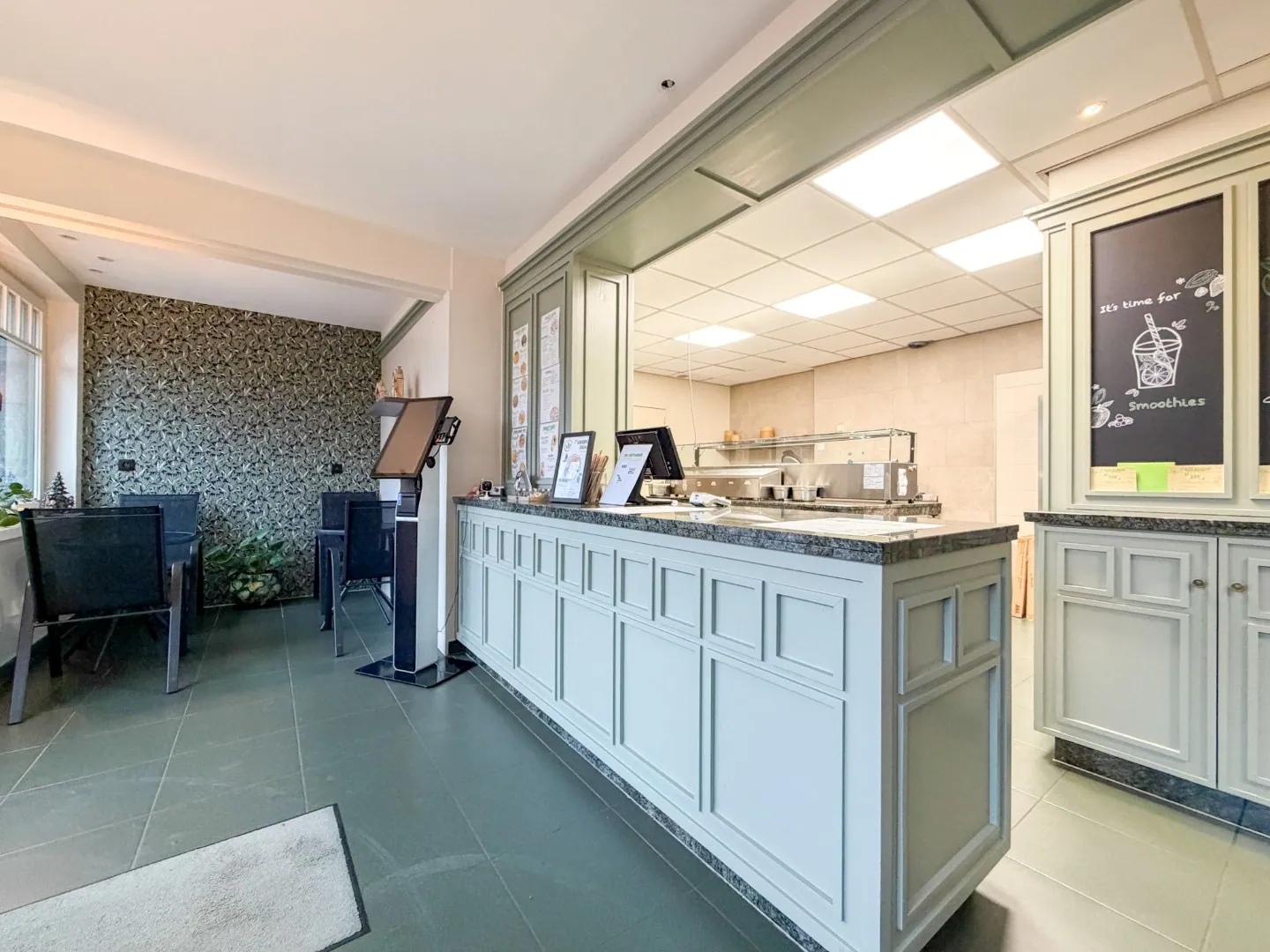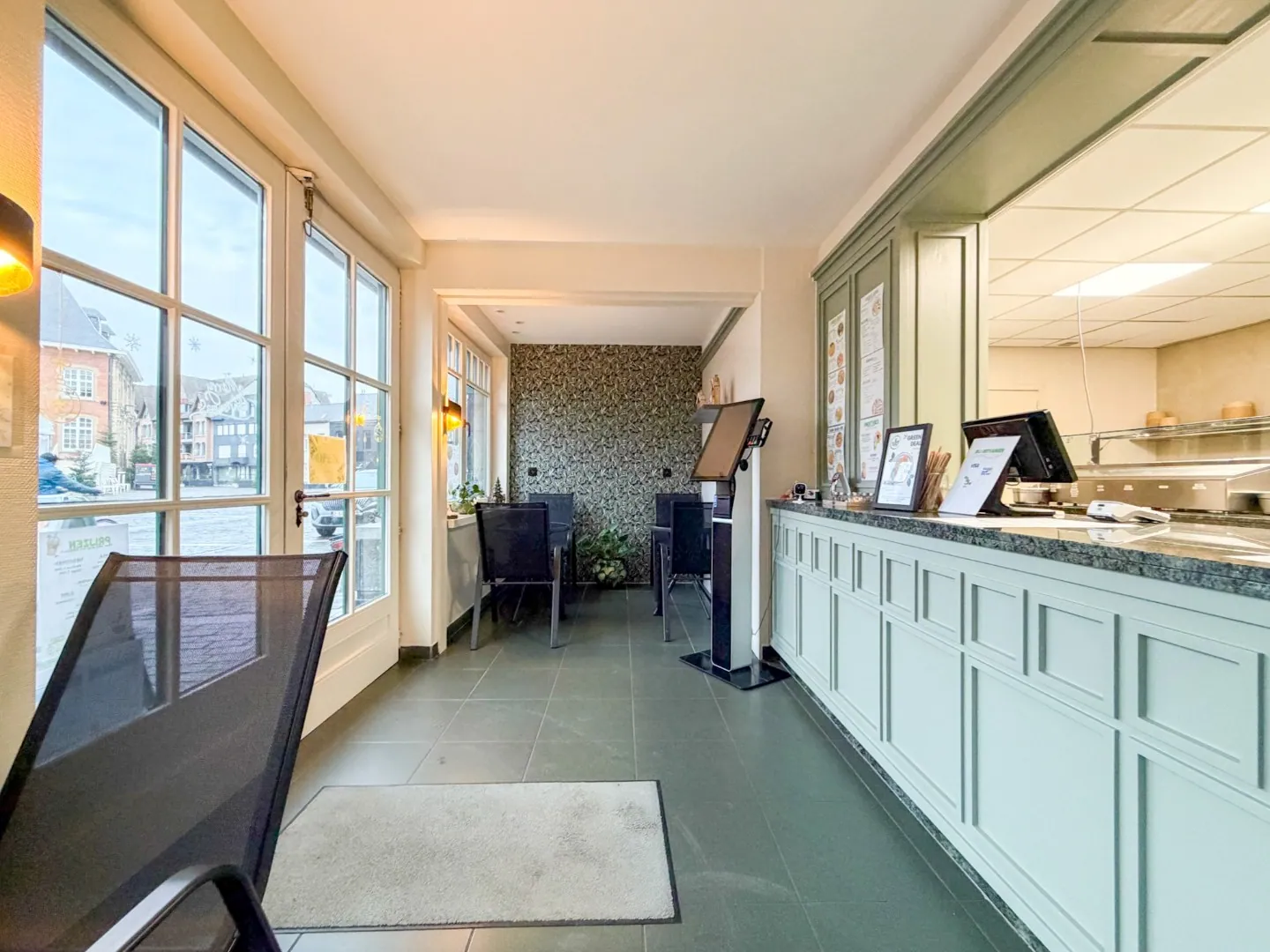Het pand is in goed onderhouden staat en uitgerust voor uitbating als voedingszaak (met o.a. toog, etalage, atelier, systeemplafond met inbouwverlichting, verwarming, tegelvloeren, inox/betegelde wanden) en met bijkomend voordeel voldoende gratis parkeergelegenheid voor de deur. De zaak is uitgerust met kwaliteitsvolle materialen zoals hardhout, natuursteen en heeft een grote hoeketalage, de inrichting en gevel werden in 2024 opgefrist.