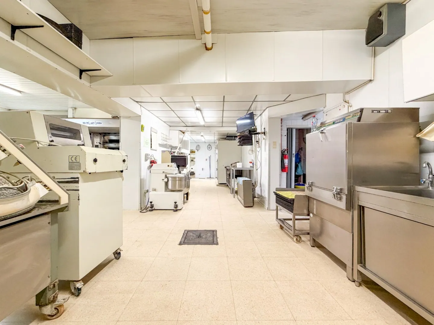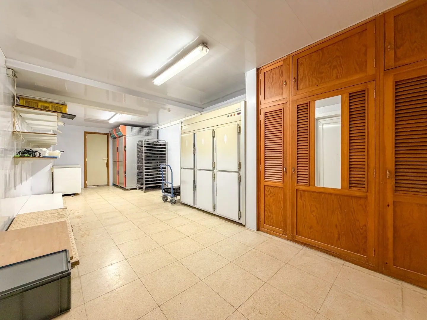 Bij het handelspand hoort een woning, gelijkvloers keuken/kantoor, productieatelier (met opslag en koeling) en groot magazijn/opslagruimte.