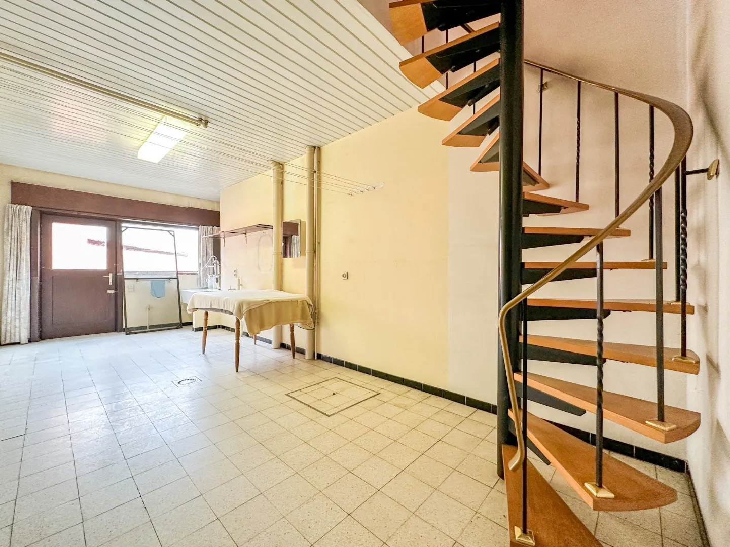 Op de GELIJKVLOERSE VERDIEPING bevinden zich: de inkomhal, inpandige garage, ruime wasplaats met doorgang naar het terras en de tuin, een berging, stooklokaal en een 1e apart toilet.